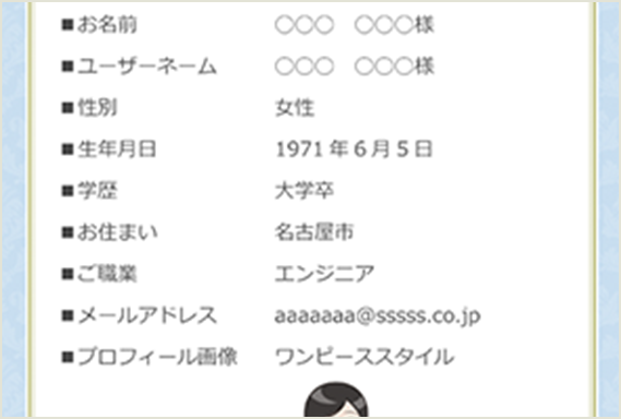 メールを開いていただき本文に記載されているhttpから始まるURLをタップして下さい。次にフォームにお客様情報(お名前、性別、生年月日、ご学歴、お住まい(市か郡まで)、ご職業、プロフィール画像、当社をお知り頂いたきっかけ)をご入力下さい。