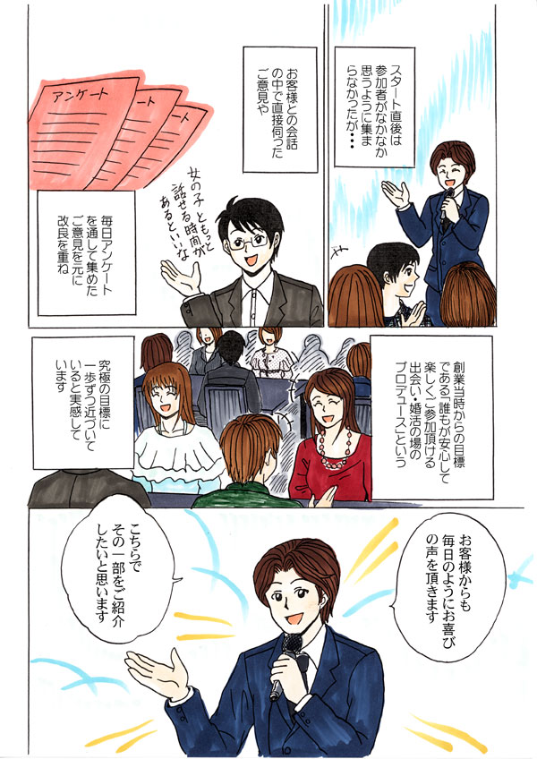 マイページMy page >ログインできない方はこちら エヴァのふれあいパーティー総合TOP エヴァのふれあいパーティーが誕生したワケ 当社代表の宇佐美が婚活パーティーで奥さんと出会い結婚したいきさつと、エヴァのふれあいパーティーを立ち上げた理由をここでご紹介します♪ マンガエヴァのふれあいパーティーが誕生したワケ 高いカップル率の秘密はこちら婚活パーティーの進行方法